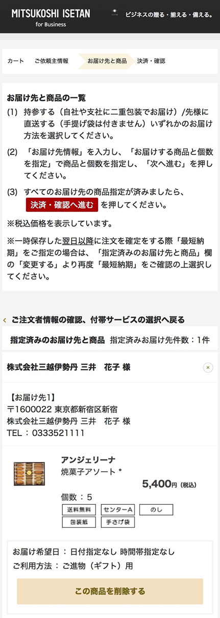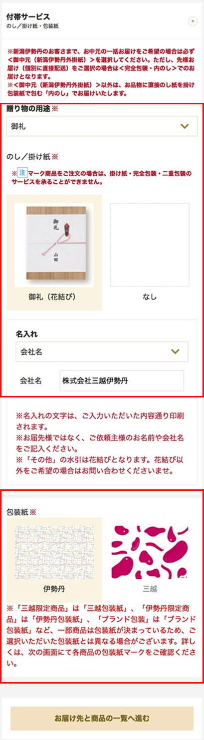 のし/掛け紙への名入れをご希望の場合は、記載したい形式にチェックを入れ、会社名やお名前を記入します。包装紙は、伊勢丹または三越の包装紙をお選びいただけます。入力が完了したら、ご登録内容を確認し、[お届け先と商品の一覧へ進む]をタップします。