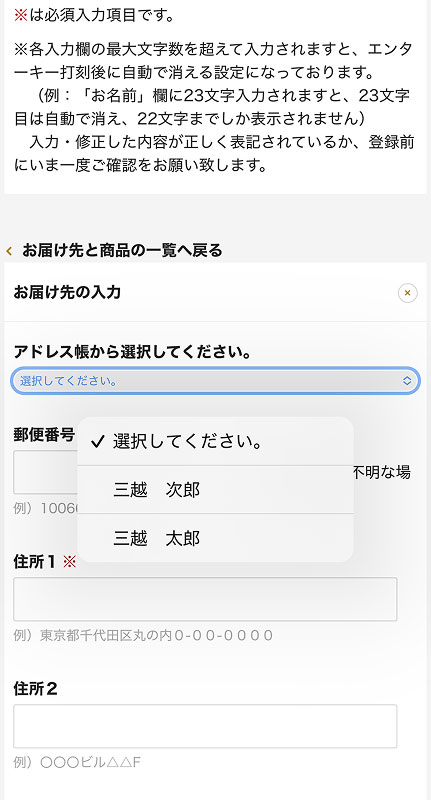 - プルダウンを選択すると、あらかじめ登録いただいたお届け先一覧が表示されます。お届け先を選択し、内容を確認してください。