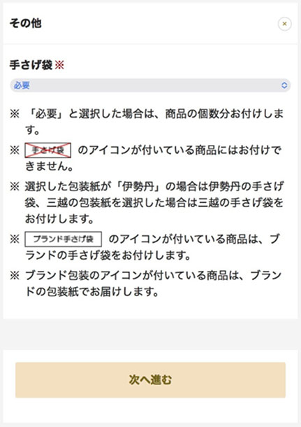 - 手提げ袋「必要」「不要」を選択して、「次へ進む」ボタン押します。