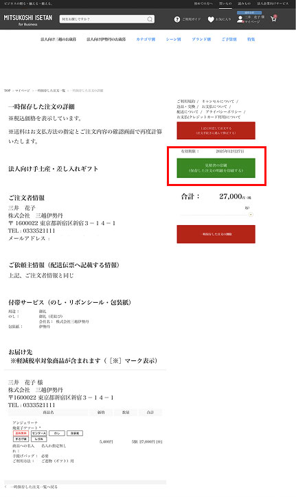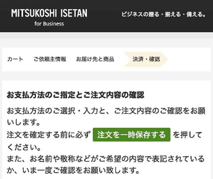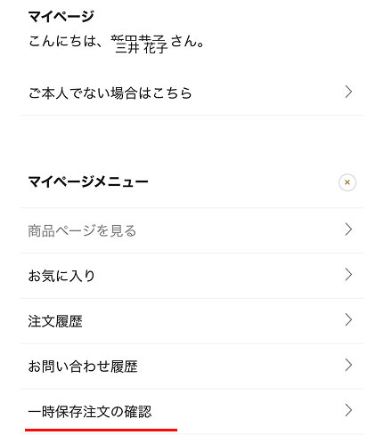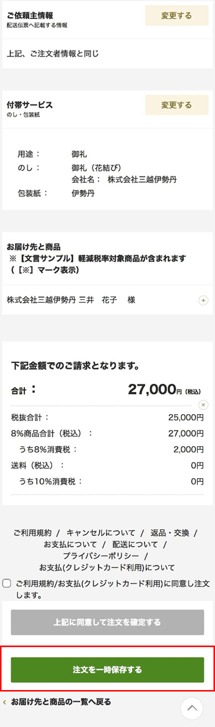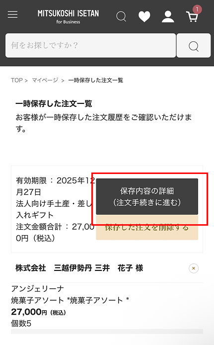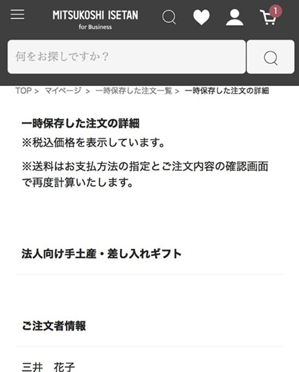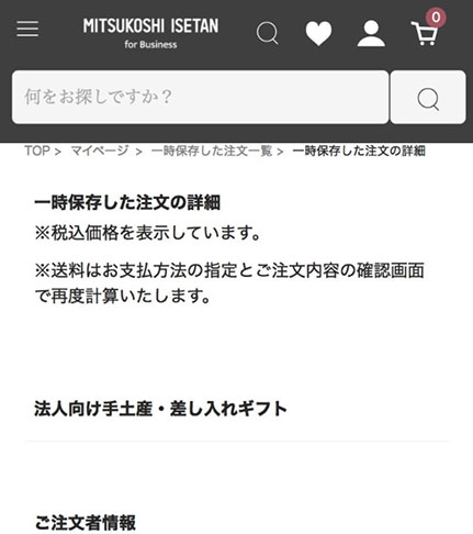 - 注文情報を一時保存する場合は、注文内容を確認し、[注文を一時保存する]をタップしてください。