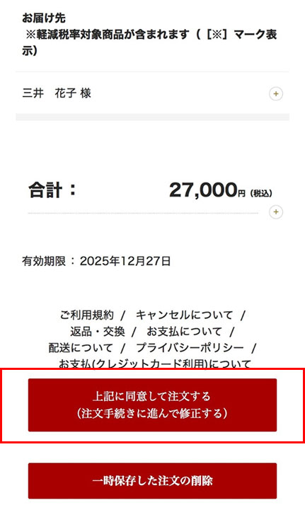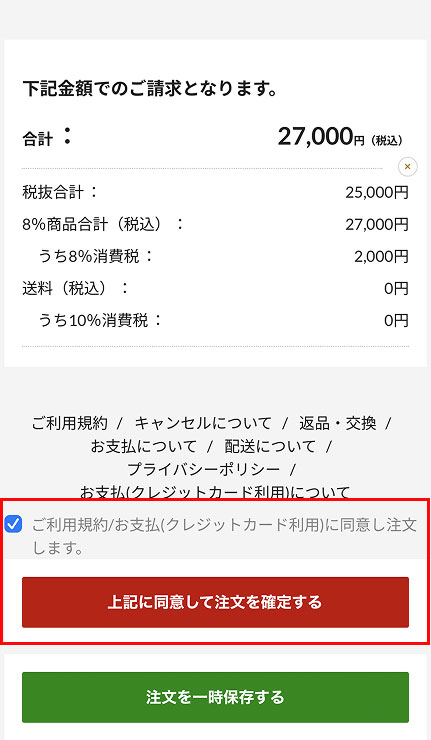 ご利用規約/キャンセルについて/返品・交換/お支払いについて/配送について/プライバシーポリシーを確認し、[上記に同意して注文を確定する]をタップ。