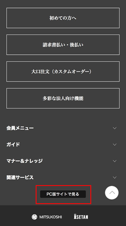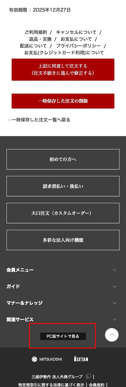 「一時保存した注文一覧」ページの下側に「PC版サイトで見る」をタップ。