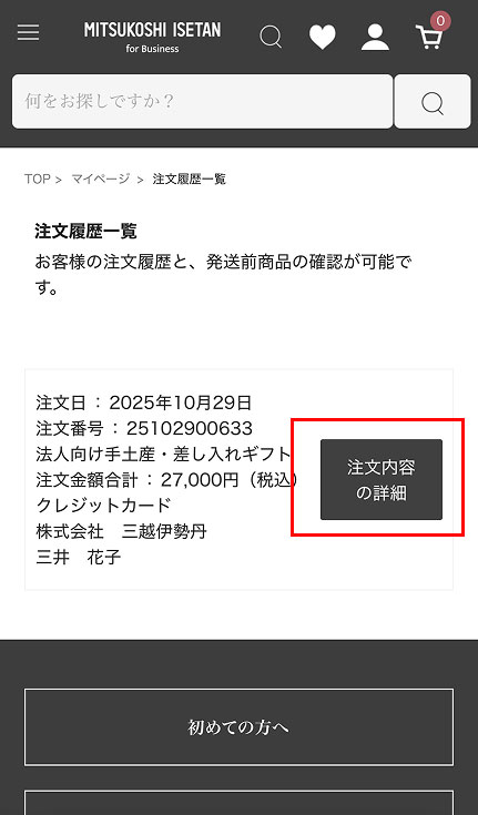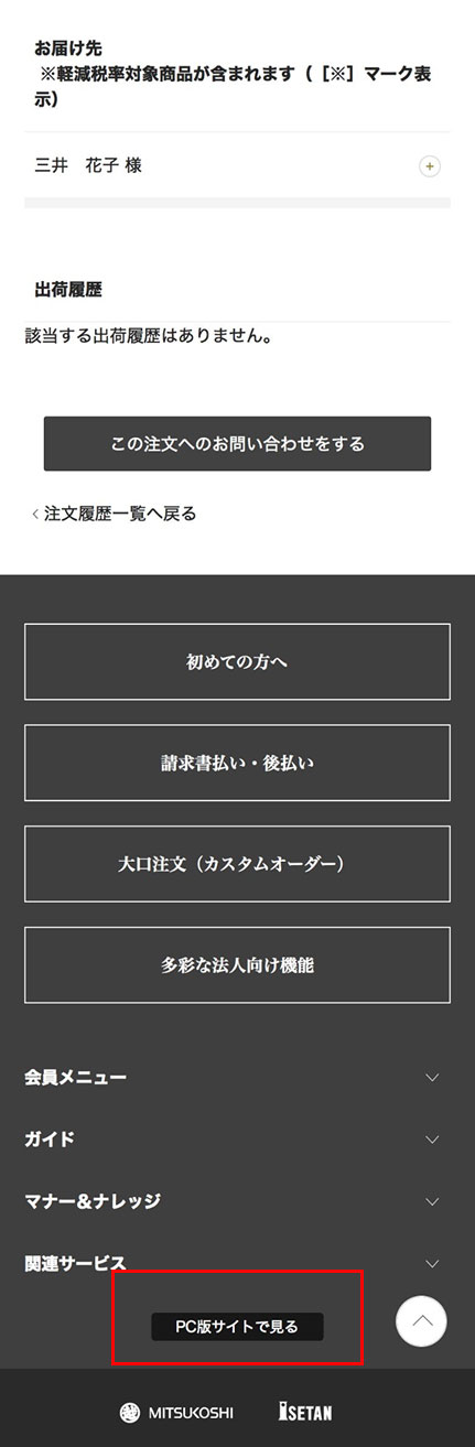 - 「注文内容の詳細」ページの下側の「PC版サイトで見る」をタップ。